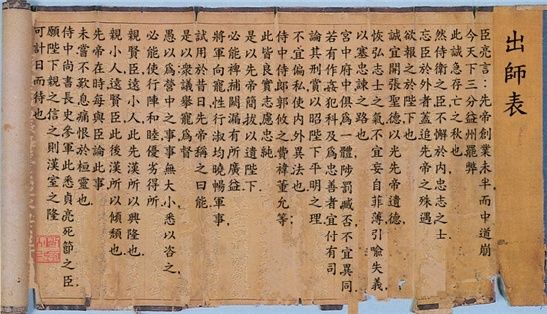 신은 본래 하찮은 포의[11]로 남양 땅에서 논밭이나 갈면서 난세에 목숨을 붙이고자 하였을 뿐, 제후를 찾아 일신의 영달을 구할 생각은 없었사옵니다. 하오나 선제께옵서는 황공하옵게도 신을 미천하게 여기지 아니하시고 무려 세 번씩이나 몸을 낮추시어 몸소 초려를 찾아오셔서 신에게 당세의 일을 자문하시니, 신은 이에 감격하여 마침내 선제를 위해 몸을 아끼지 않으리라 결심하고 그 뜻을 받들었사옵니다. 그 후 한실의 국운이 기울어 싸움에 패하는 어려움 가운데 소임을 맡아 동분서주하며 위난한 상황에서 명을 받들어 일을 행해온 지 어언 스물하고도 한 해가 지났사옵니다.